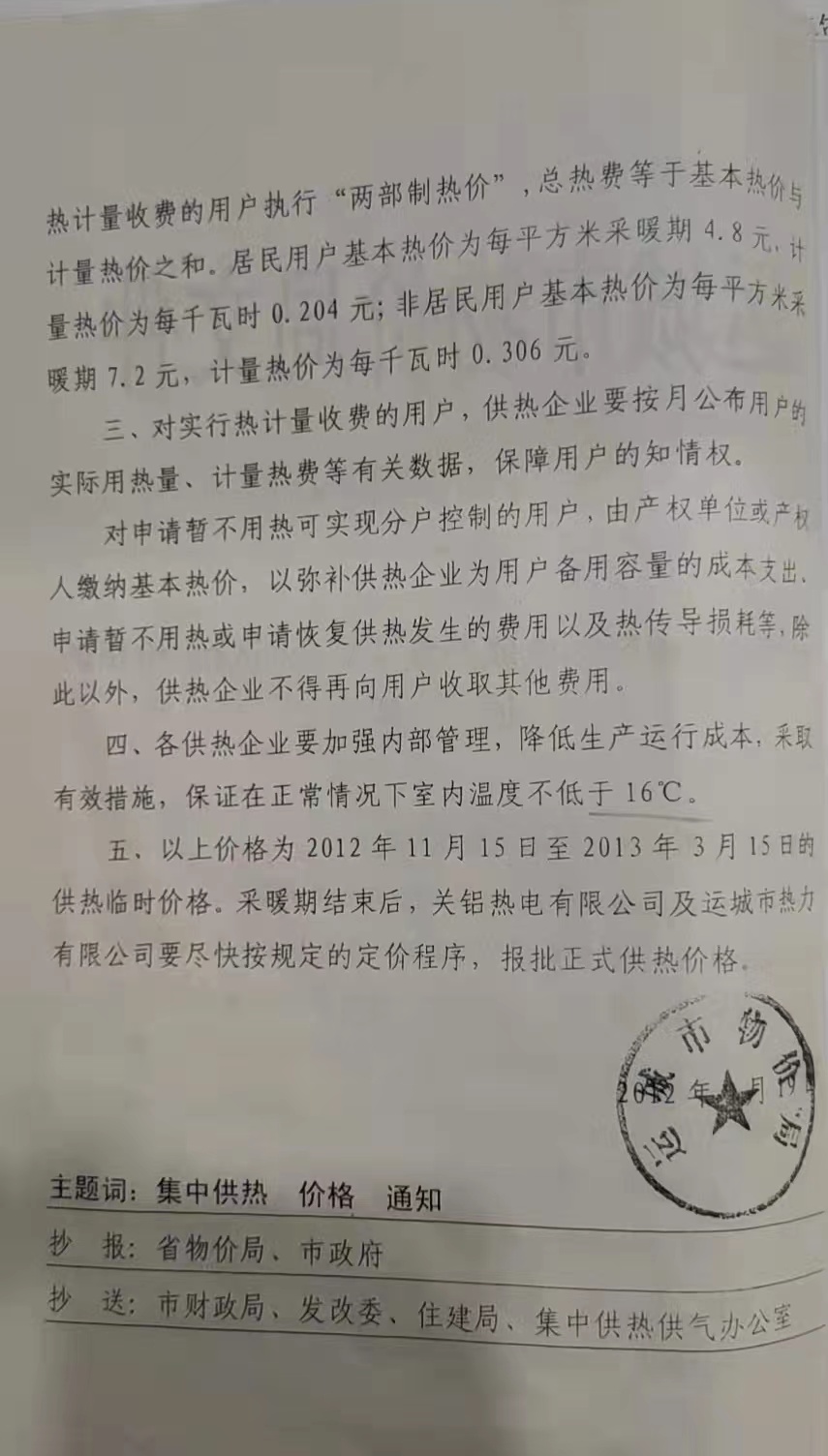 關(guān)于運城市城區(qū)熱電聯(lián)產(chǎn)集中供熱(試行)價格的通知